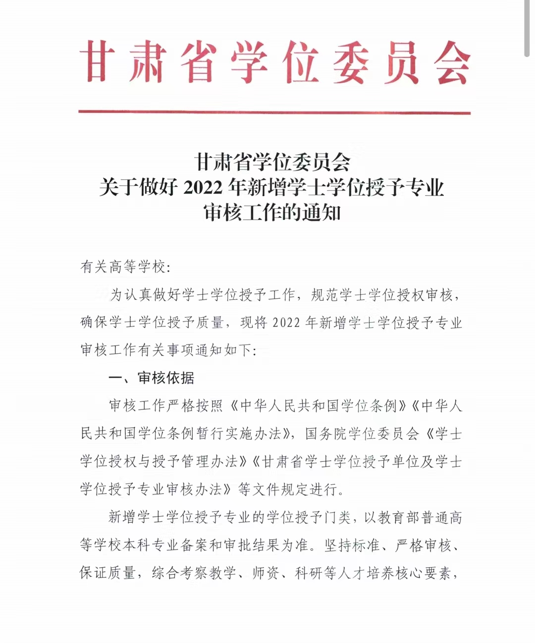 2022年3月11日,甘肃省学位委员会下发《关于做好2022年新增学位授予专业审核工作的通知》,要求在经教育部批准或备案的新增本科专业、有首届毕业生的本科专业,学校应向省学位委员会提出学位授予专业授权申请,并开展学位授予审核工作。