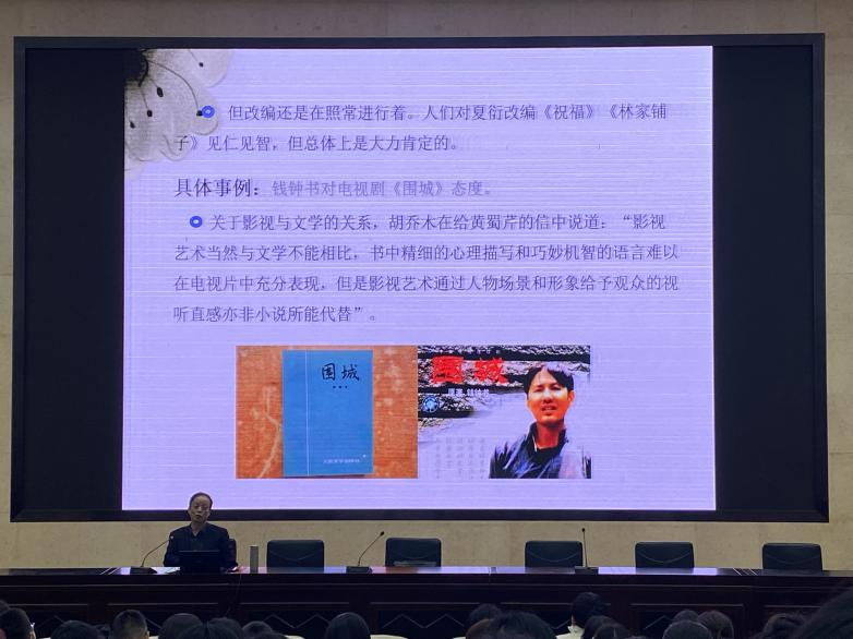 首先,王老师从“视觉文化盛行的全媒体时代,人类已然进入到读者时代,文学的存活空间越来越小,更有甚至,有人认为如不考虑影视的‘可改编性’,不能为其所用,文学必将失去它的现实存在的必要性”这一问题入手。随后,为同学们介绍了传统的看法,并以《阿Q正传》作为典型事例、《围城》作为具体事例,生动形象地为同学们阐释了自己的观点,就提出的问题作出了明确的回答。最后,王老师告诉同学们:“问题就是出路,文学在今天不是没有价值,而是大有可为,它有可能从根本上改善中国影视平庸化,浅俗化的弊端,简单地将二者关系对立,肯定没有出路,也不符合当前文化发展的事实。”