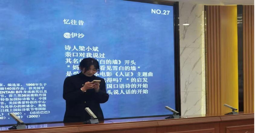 会议第三项由天水师范学院学生自愿上台朗诵自己的诗歌,同学们热情高涨,纷纷举手上台。学生们的诗歌作品获得了伊沙老师和在场诗人的好评。