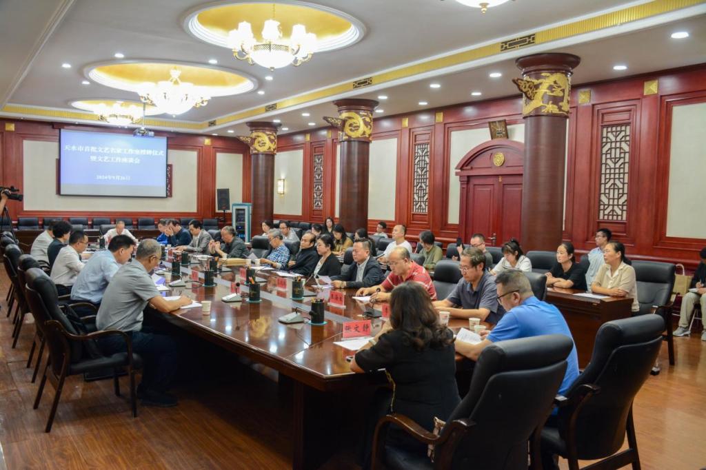 2024年9月26日下午,“天水市首批文艺名家工作室授牌仪式暨文艺工作座谈会”在市政府常务会议室举行。天水市文联主席张铖宣读《天水市文学艺术界联合会关于命名天水市首批文艺名家工作室的决定》,随后天水市委常委、宣传部长王文东,天水市副市长汪小娟,为文艺名家工作室授牌。