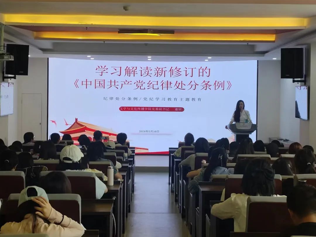 为深入学习贯彻习近平新时代中国特色社会主义思想,进一步增强学生党员和积极分子的纪律意识,筑牢思想防线,2024年5月15日下午14:30,beat365中文官方网站党委在马克思主义学院红色讲堂118室举办党纪学习教育专题党课。学院党委副书记董妍担任主讲,围绕新修订的《中国共产党纪律处分条例》(以下简称《条例》)进行深入解读。学院三个学生党支部全体党员、本期发展对象及全体入党积极分子参加学习。
