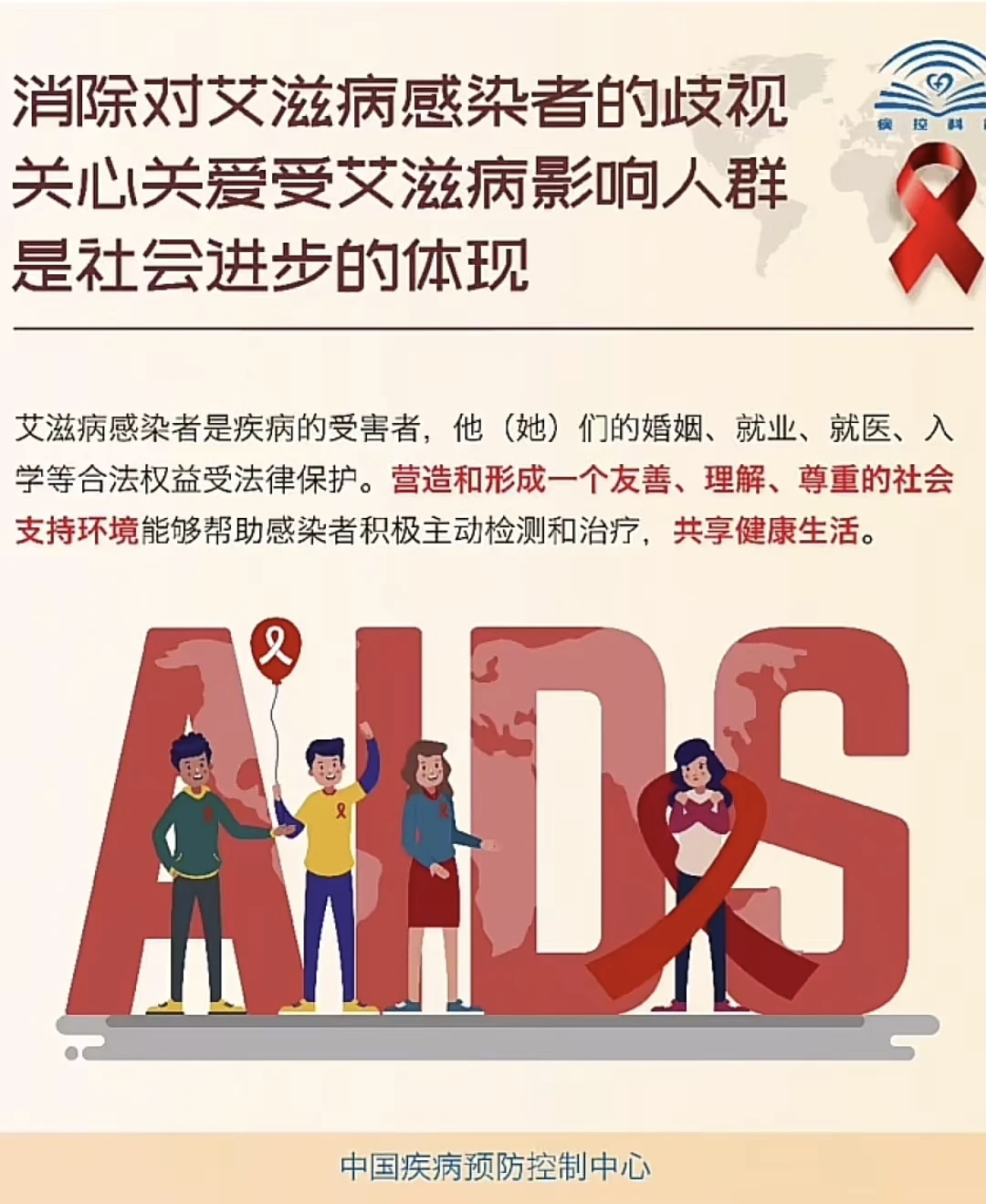 4.消除歧视,友善共处关怀艾滋病感染者,不歧视、不孤立,日常握手、交流、共同学习等社交接触不会传播病毒。