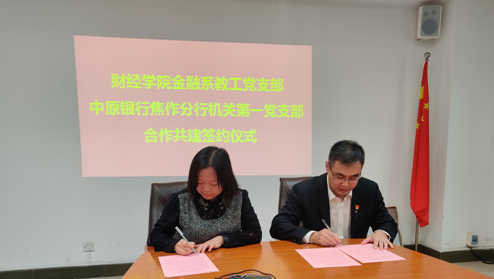 为进一步做好党支部党建工作,服务教学科研育人,金融系教工党支部与中原银行焦作分行机关第一党支部于2021年10月13日下午举行了支部共建协议签约仪式,并共同开展了“党建工作与业务相结合经验交流”主题党日活动。此次支部共建得到了学院党委的高度重视,学院张良副书记以及金融系党支部党员参加了本次活动。
