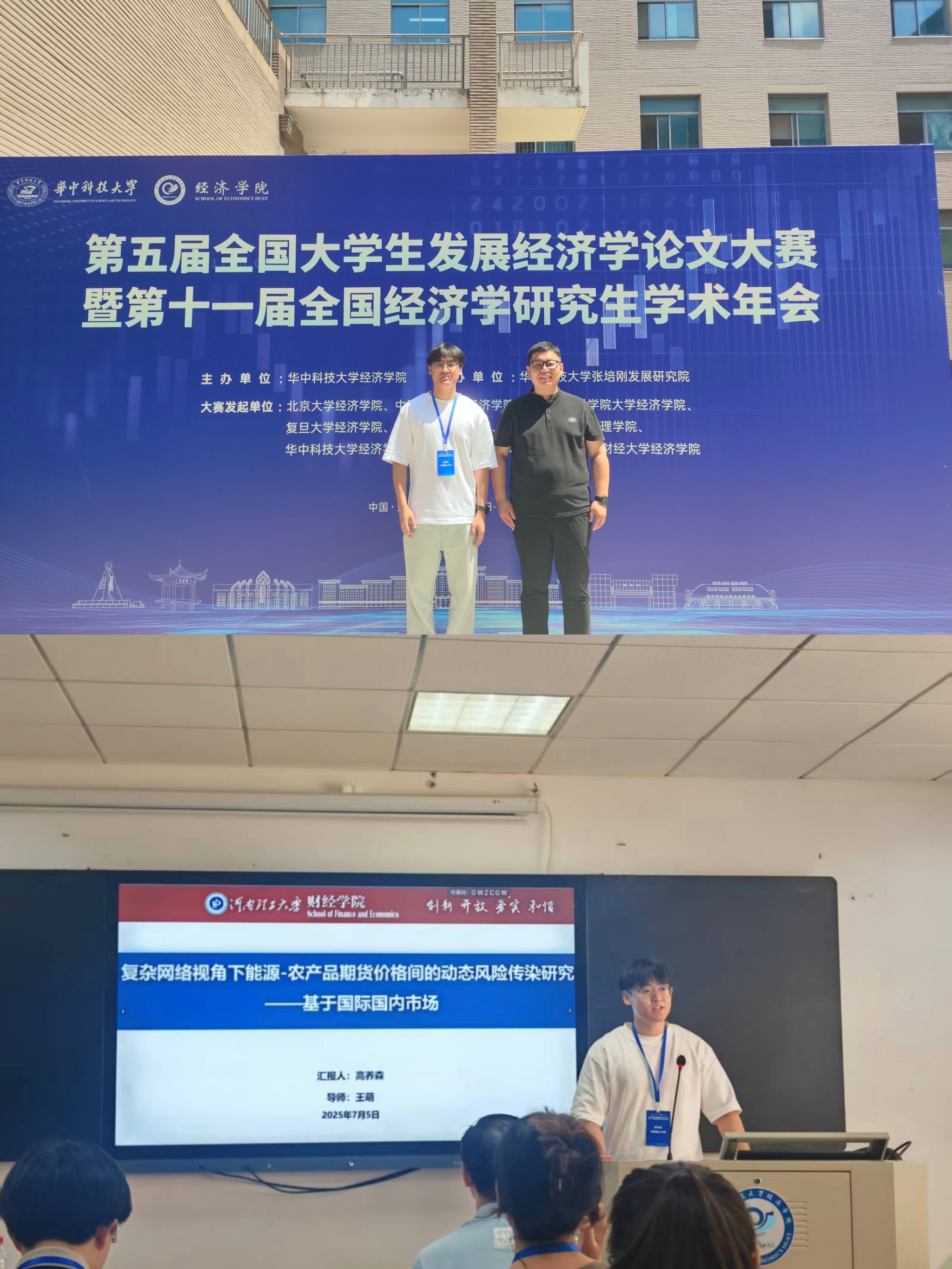 7月4日至6日,第五届全国大学生发展经济学论文大赛在武汉成功举办,本届论文大赛由华中科技大学经济学院主办。大赛旨在以习近平新时代中国特色社会主义思想为指导,紧密结合中国经济发展实践,运用现代经济学研究方法,围绕发展经济学各领域重大理论与现实问题展开创新性研究,力争做到“讲好中国故事、传播好中国声音、增强在国际上的话语权”。新葡萄官网金融专硕高养森(指导教师王萌)提交的论文《复杂网络视角下能源-农产品期货价格间的动态风险传染研究——基于国际国内市场》入选大赛终评环节,受邀参加线下汇报,最终荣获硕士组三等奖,实现了我校在该项赛事获奖的首次突破。