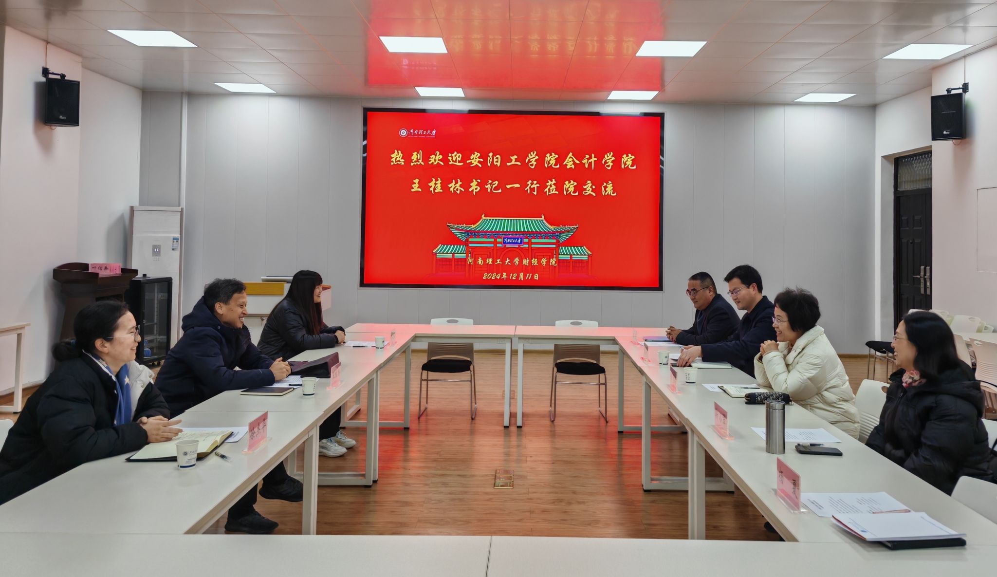 12月11日下午,安阳工学院会计学院党委书记王桂林一行莅临学院,就专业建设进行了深入交流。新葡萄8883官网amg官网党委书记王景琳、副院长张圣利及学院实验室、财管系、教科办相关人员陪同交流,交流会在学院1308会议室举行。