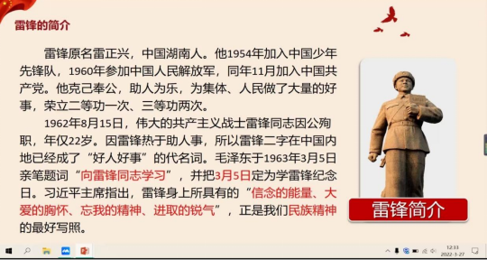 本次活动由翟雪静同学主持,首先,她介绍了雷锋参加工作、参军入伍以及因公殉职的经历,同学们初步了解了雷锋同志平凡而伟大的一生。其次,主持人带领同学们重读《雷锋日记》,重温那些雷锋走过的日子。日记中平凡而又有意义的话,正是雷锋精神的体现,也是我们当代青年所应该具备的品质。最后,主持人详细介绍了雷锋精神的具体内容和时代内涵,并倡导作为新一代青年的我们要学习雷锋精神,把青春的活力注入到祖国的血脉中,在疫情防控的岁月里留下青年的身影,让我们在社会主义建设过程中树立起青年的标杆。