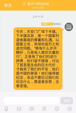会计1904班团支部组织全班同学在4月4日10:00进行就地就便形式的三分钟哀悼活动,接着便进入了网上祭奠活动,通过网上祭拜、鲜花、留言和浏览革命先烈的英雄事迹,同学们对于先烈的英勇无畏,对于他们的舍小家为大家的种种令人敬仰的品质和行为感慨万千,纷纷在QQ群里发表了各自的感想,这是一种共情,这更是属于国人应有的自豪感,我们应该为此骄傲。