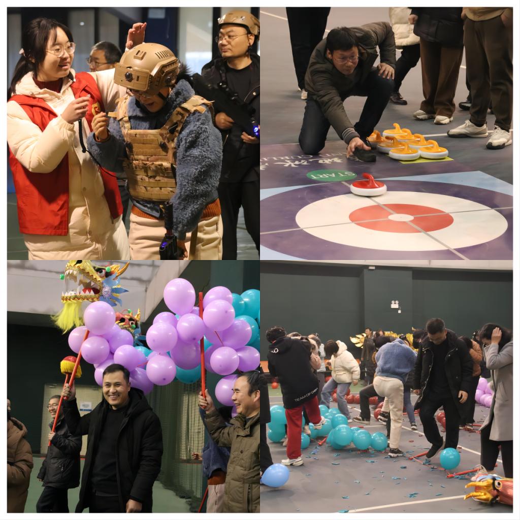 趣味运动会上两个单位教职工混合后分为8支队伍在“龙腾盛世”“旱地冰壶”“战火青春”3个项目角逐。在“龙腾盛世”比赛中,老师们分工合作,配合默契,气球组成的长龙在老师们的巧手下逐渐成形,并完美展现“神龙现世,龙行天下,盘龙云海”的动作。在“旱地冰壶”比赛中,红黄双方依次掷球,你来我往,好不热闹。在“战火青春”环节,老师们穿戴护具、头盔,手持道具枪,身手矫健,灵活穿梭在掩体中,体验激烈的战斗氛围。活动现场笑声此起彼伏,整个运动会充满活力和欢乐。