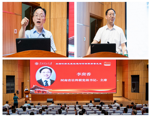 在上午主题报告环节,河南省社科联党组书记、主席李庚香报告的主题是“中原大地起高峰——论双循环新发展格局与河南高质量发展”,由我校副校长朱建光主持;河南省社会科学院院长兼我校太行发展研究院院长谷建全报告的题目是“河南高质量发展的短板与对策”,由郑州大学管理工程学院院长朱永明主持;郑州大学旅游管理学院院长李金铠报告的主题是“新阶段新理念新格局中的绿色低碳转型”,由河南大学经济学院院长宋丙涛主持;河南大学中原发展研究院院长高保中报告的题目是“主动融入新发展格局 构建河南发展新优势”,由河南科技大学管理学院院长邓国取主持;河南理工大学新葡萄8883官网amg官网院长梁丽娟报告的主题是“河南省县域财政预算绩效管理:成效、问题与对策”,由郑州航空工业管理学院经济学院院长郝爱民主持。