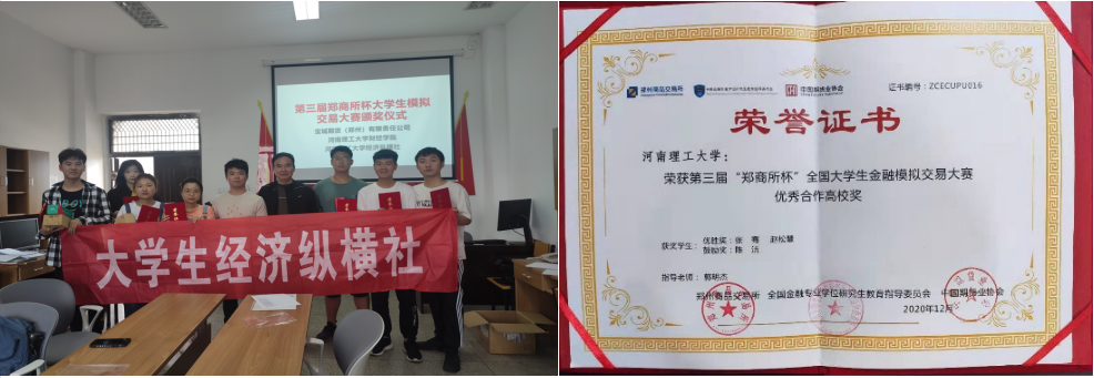 受到疫情防控影响,本次颁奖典礼采用小型沙龙的形式举行。金融系主任郭明杰代表大赛合作方宝城期货公司向获奖的同学颁发了证书和奖品。河南理工大学大学生经济纵横社为此次比赛的顺利完成做了大量协调工作,负责人张晓艳同学全程做了周密的组织。颁奖仪式后,师生畅谈了比赛的经历,大家一致认为大赛实现了“以赛促学”的目的,不仅给在校大学生们提供了贴近市场、真切感知市场变化的平台,也给同学们历练心智、提高交易能力提供了机会。