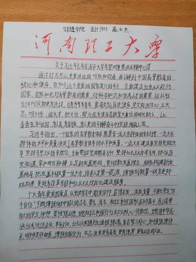 在这次讲话中,总书记指出:中国教育是能培养出大师来的,我们要有这个信心,开拓视野,兼收并蓄,扎扎实实把中国教育办好。这为中国的教育事业指明了方向。总书记还指出:广大青年要爱国爱民,从党史学习中激发信仰,获得启发,汲取力量,不断坚定“四个自信”,不断增强做中国人的志气,骨气,底气,树立为祖国为人民永久奋斗,赤诚奉献的坚定理想。这次学习使总书记的话深入人心,让同学们感慨颇多,使他们更加坚定了为中华民族伟大复兴而努力奋斗的决心和信心。学习结束后,同学们用笔记录下了此次学习的所学,所思,所想,收获满满。