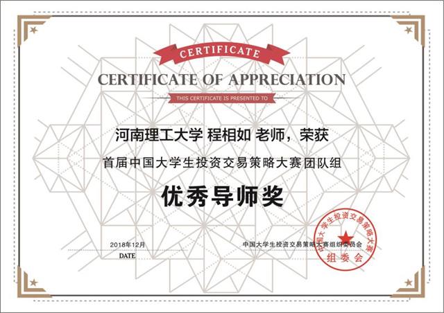 在经历了为期两个月的线上交易以及报告撰写后,新葡萄官网成功进入团队赛十强。经评委会综合评定,新葡萄官网学生团队荣获冠军,获得奖金3000元。程相如老师荣获优秀指导教师奖,奖金5000元。17级财管学生宋昂哲获得个人赛冠军,奖金3000元,15级金融学生李艳坤获得个人赛季军,奖金1000元。