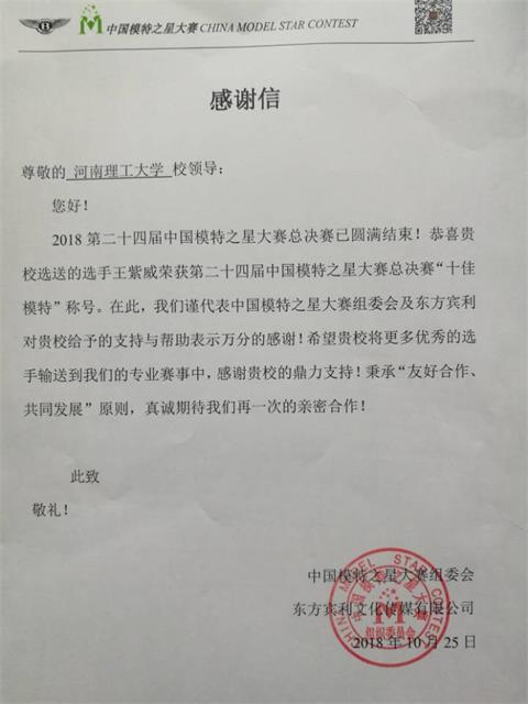 近日,中国模特之星组委会向我校发来感谢信,感谢我校对大赛的支持。我校新葡萄8883官网amg官网选送的王紫威同学荣获2018第二十四届中国模特之星大赛总决赛“十佳模特”称号。
