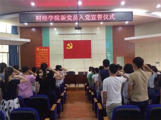 仪式中,与会人员全体起立,奏唱国际歌。全体新党员在领誓人的带领下,面对鲜红的党旗,举起右手,握拳过肩,庄严宣誓,志愿加入中国共产党,为共产主义奋斗终身,随时为党和人民牺牲一切,永不叛党。随后,15级会计学专业学生井俊代表全体新党员发言,表示为加入光荣而伟大的党组织感到骄傲和自豪,将继承党的光荣传统,按照党员的标准严格要求自己,使自己在思想上、行动上真正入党,真正做到一个党员就是一面旗帜。国贸系教工党支部书记郭明杰代表老党员发言,他号召全体党员时刻牢记党员身份,不忘党组织的培养和关怀,脚踏实地,努力工作,不断完善自我,做一名优秀的共产党员,以更加出色的成绩为党旗增辉!
