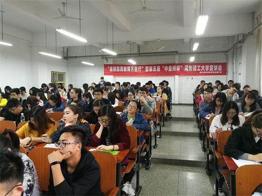 据悉,“中金所杯”全国大学生金融知识大赛由中国金融期货交易所和中国期货业协会联合举办,现已成功举办四届,先后有1100余所中外高校参赛,11.5万多莘莘学子报名。通过本次宣讲会,以期让同学们了解大赛相关情况,鼓励同学把积极参赛,学以致用,在参赛过程中,发现问题,以用促学,不断提升专业水平。
